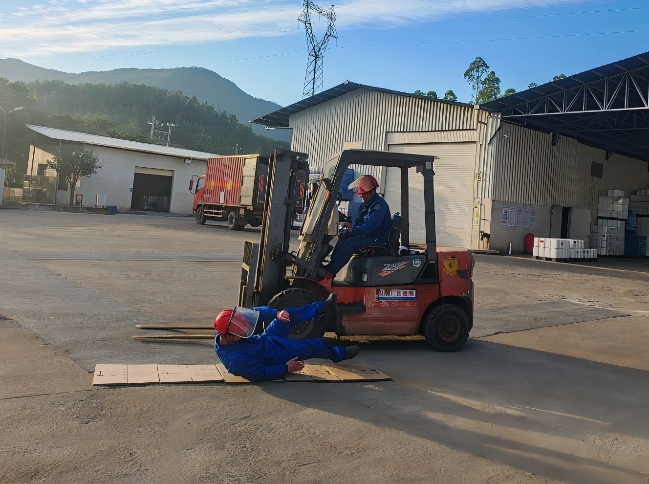 模擬三酸車(chē)間叉車(chē)駕駛員操作叉車(chē)運(yùn)作貨物時(shí),因滿(mǎn)載貨物視線(xiàn)不良,未注意好前方情況,與正在盤(pán)點(diǎn)貨物的倉(cāng)管員發(fā)生碰撞。