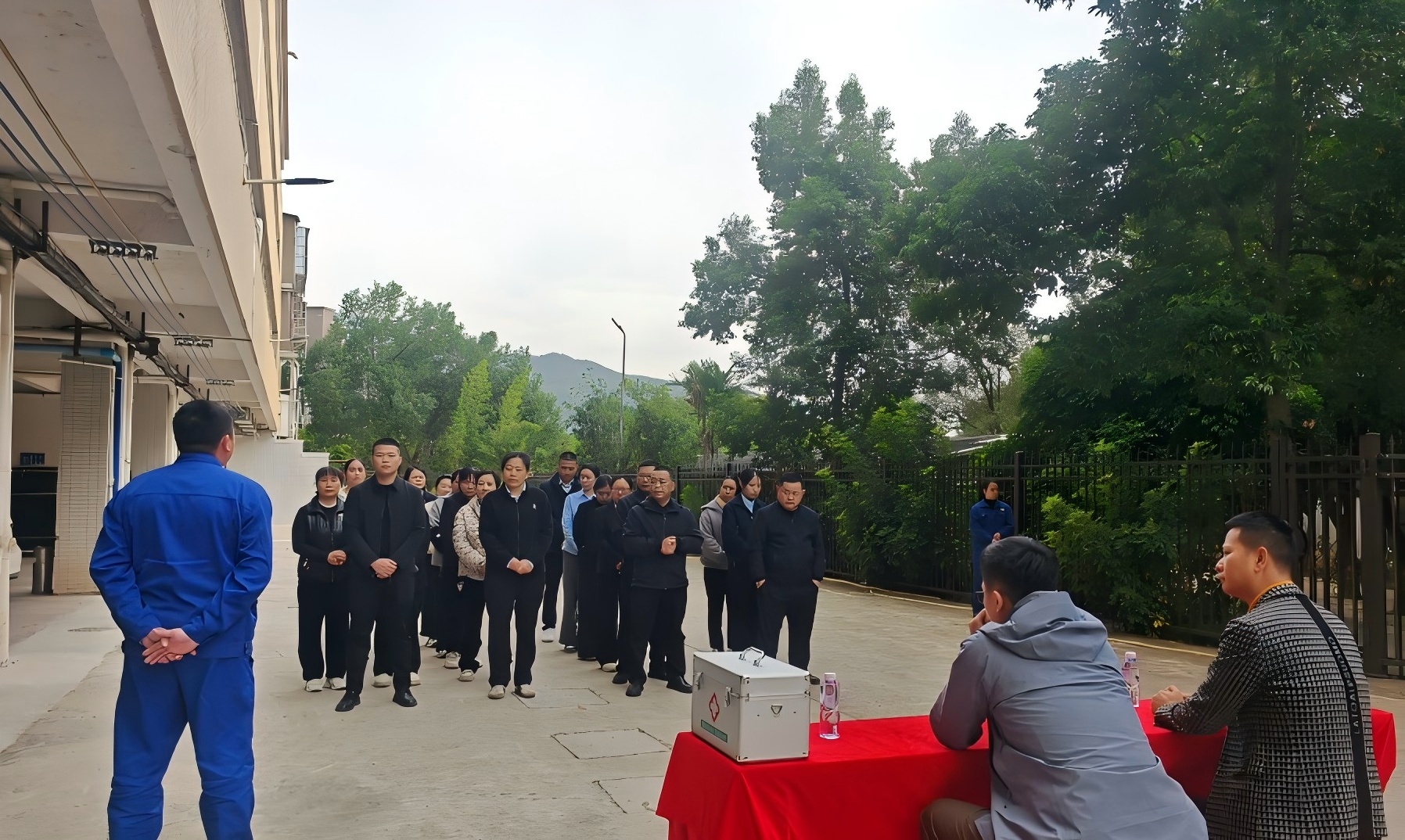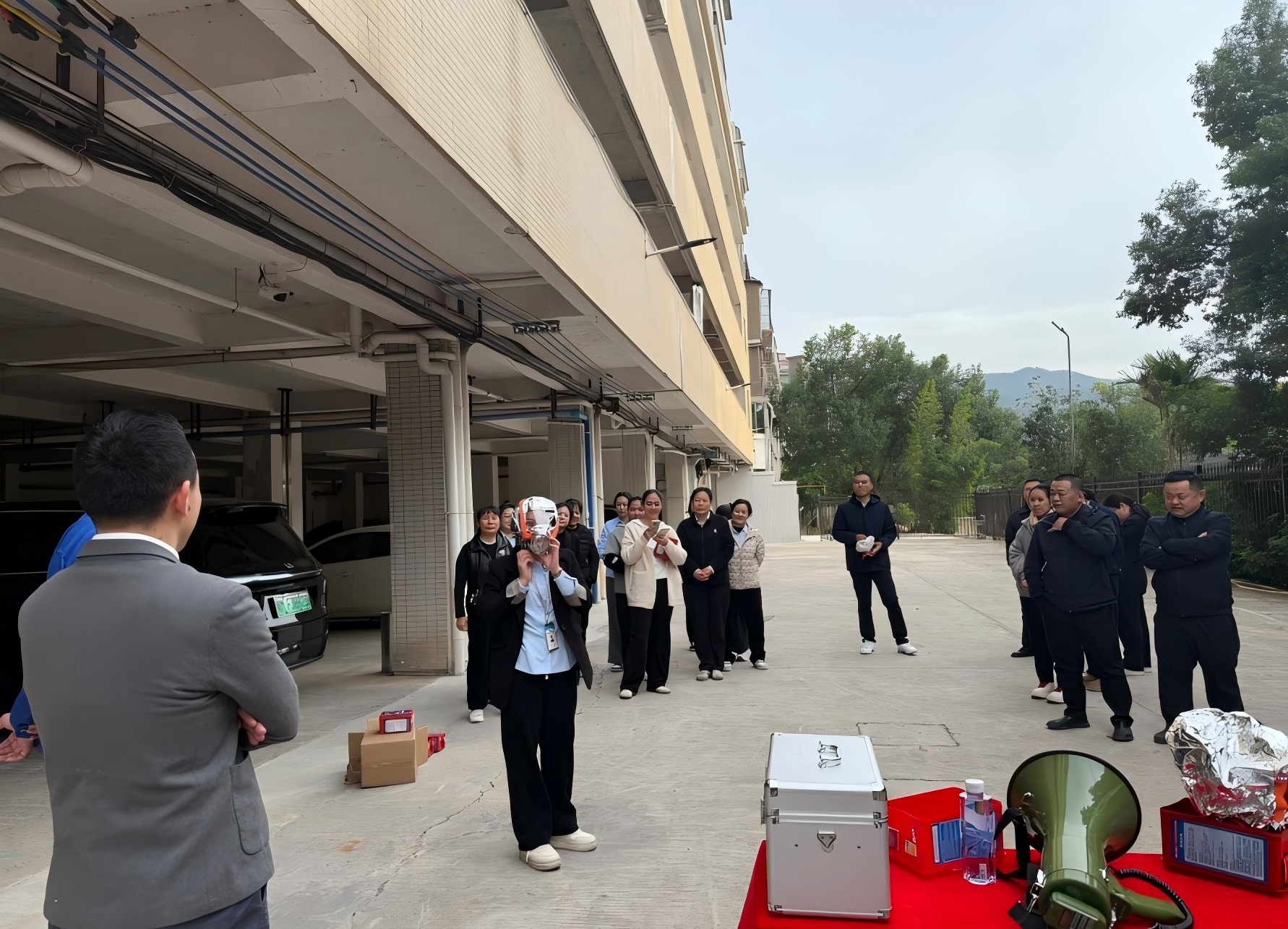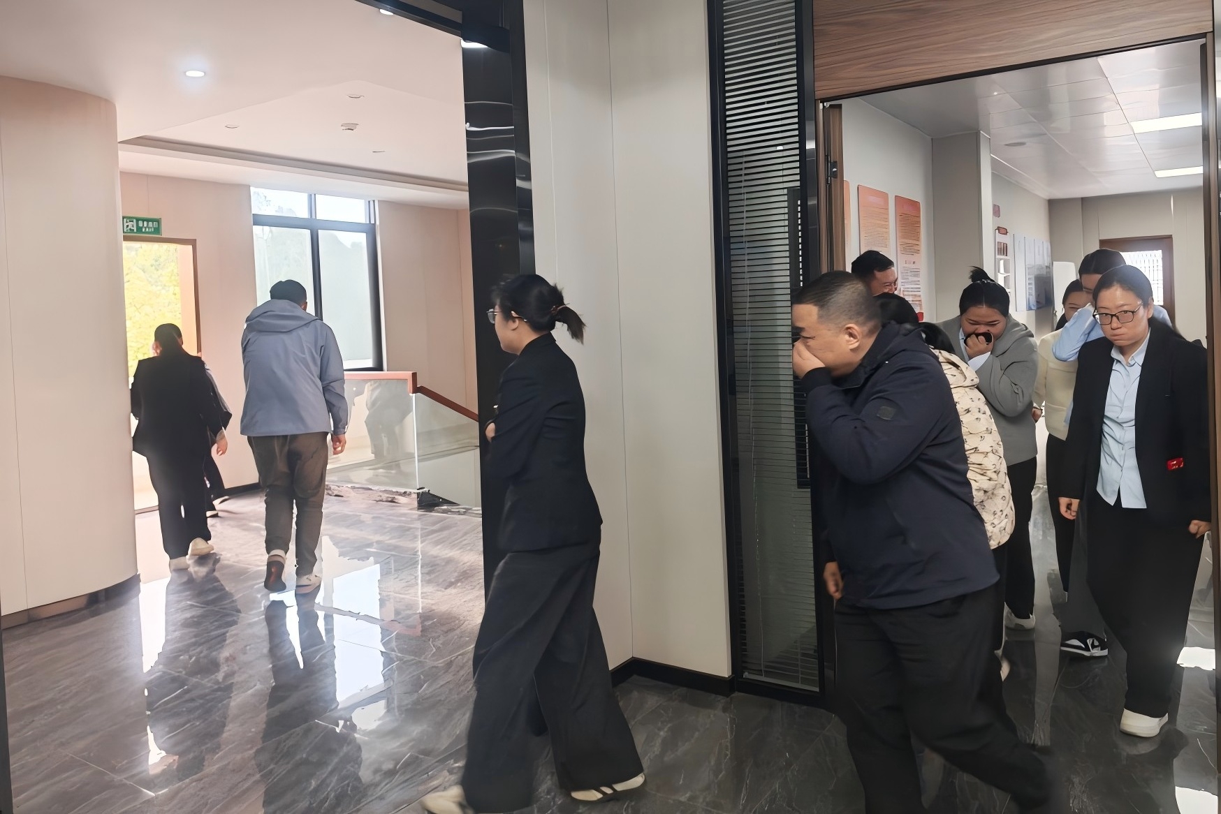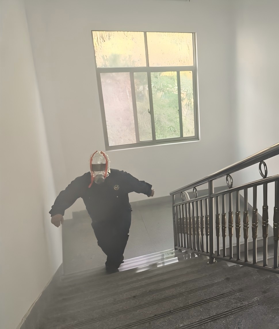 模擬茶水間突發(fā)火災(zāi),疑似電器使用不當(dāng)著火,火勢(shì)發(fā)展迅猛并產(chǎn)生大量濃煙,保潔員發(fā)現(xiàn)后大喊“著火了,著火了”,并且拉響消防警報(bào),接報(bào)后,相關(guān)人員使用滅火器撲救火災(zāi),并通知所有人員緊急撤離至安全地帶,最后進(jìn)行人員清點(diǎn)。